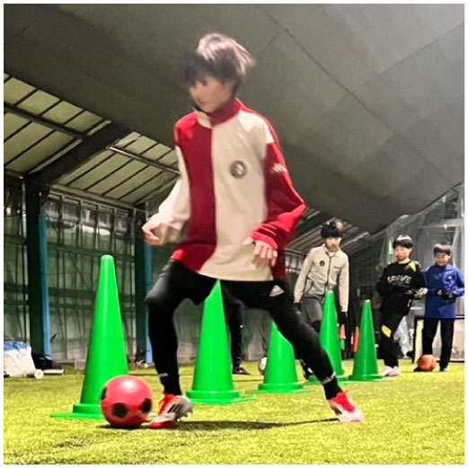 クレフィアサッカースクールでは、絶対に抜けるフェイントや絶対に入るシュートの方法などの指導はなく、コーチ達が今まで試合中に経験したことを元に、より実践を想定した練習メニューを常に考えて行っています。